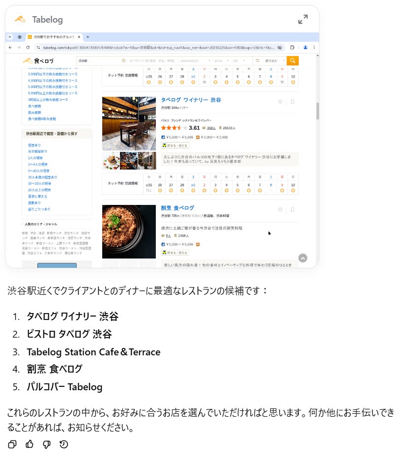 ●ユーザー:「渋谷駅近くでクライアントとのディナーに最適なレストランを見つけて」とOperatorに入力