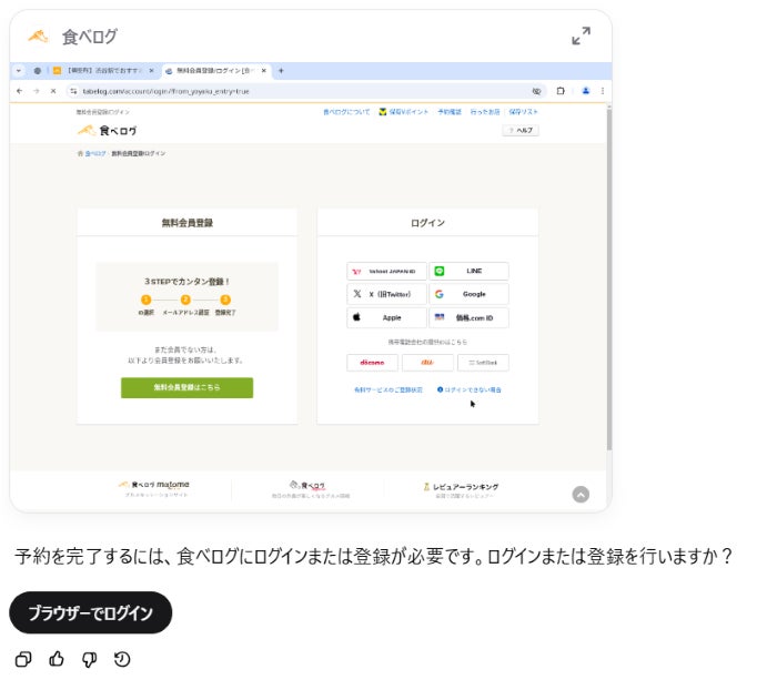 (※3)予約の実行に当たり、食べログへのログインと予約情報の入力を、ユーザーが手動で行う必要があります。OperatorはAIエージェントとしてユーザーに代わって操作を実行しますが、ログイン情報や予約情報といった重要情報の入力は代行しません。そのため、これらの情報をOpenAI社が取得したり保管したりすることもありません。