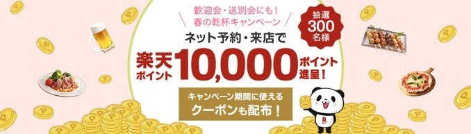 本キャンペーンでは、対象の飲食店でランチ1,500円以上、ディナー3,000円以上のコースを2名以上でネット予約・来店された方の中から、抽選で300名様に「楽天ポイント」10,000ポイントを進呈します。さらに、2回以上予約すると当選確率が2倍にアップします。また、大人数の予約ほど割引額が上がるぐるなびネット予約クーポンも同時期に配布します。これにより、「楽天ポイント」やクーポンを獲得しながらお得に春の宴会を楽しむことができます。本キャンペーンを通じて、ユーザーに良質なネット予約の体験価値を提供し、宴会の活性化を図ることで飲食店への送客を拡大します。