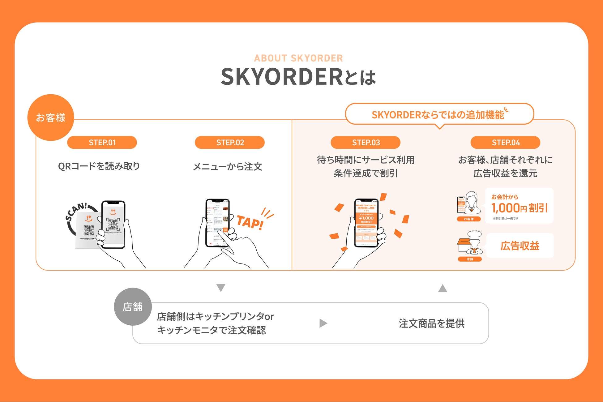 飲食店に来店されたお客様は、スマートフォンからいつでも注文できるだけでなく、『SKYORDER』に表示されたサービスを体験することで、当日のお会計から割引を受けることができます。また、お客様に割引を提供すると同時に、飲食店にも広告収益が入るモデルとなっています。