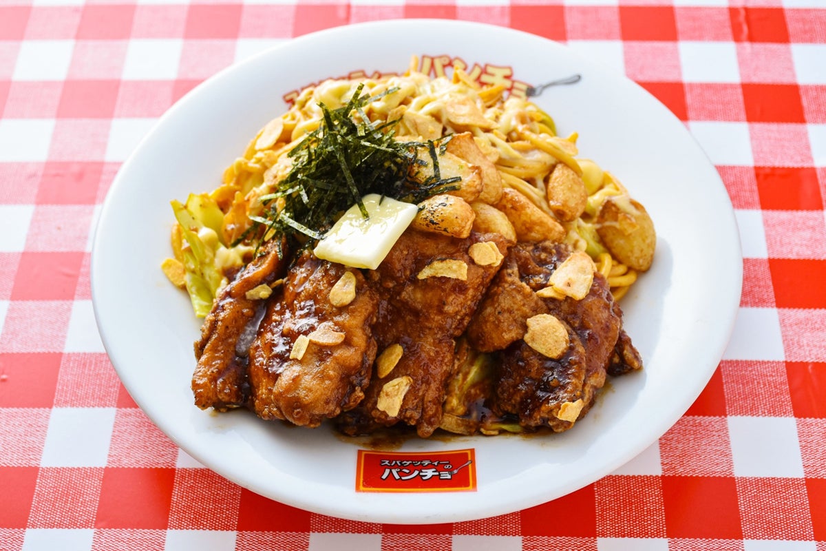 これまでの期間限定メニューで大人気のバター醤油スパゲッティーが2シーズンぶりに登場。バター醤油シリーズ第四弾となる今回は、“デカいは正義”のパンチョ魂を貫く鶏もも肉のドデカ唐揚げと丸揚げにんにくをたっぷりトッピングした、食べごたえMAXのガーリックバター醤油風味の極太麺スパゲッティーです。