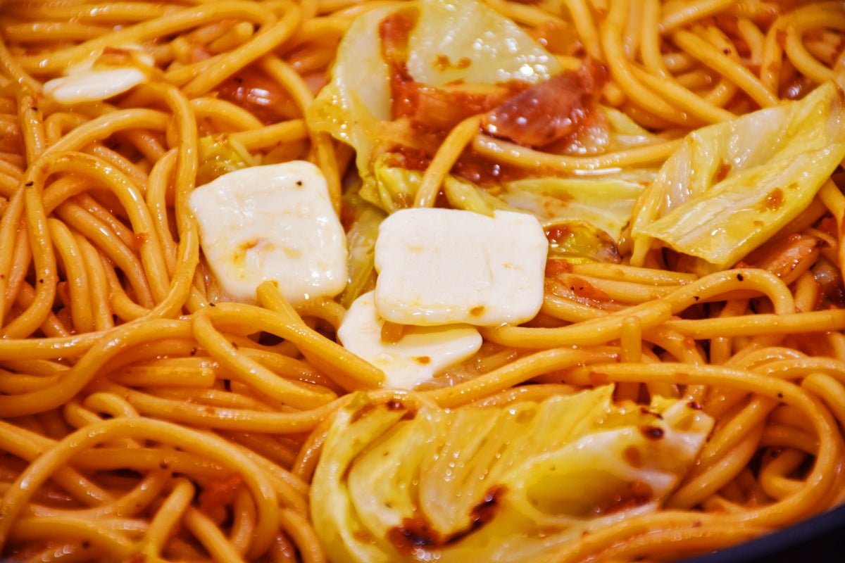 特製バター醤油ソースのうまさの秘密はズバリ「さしみ醤油」。その上にさらに乗せバター、そして仕上げに大量のわさびマヨネーズをぶっかけちゃいました。バター×マヨネーズ、油on油。でも安心してください、ワサビ風味のマヨだからさっぱりのど越しで、刻み海苔の香ばしさもあってどんどんフォークが進むはず!