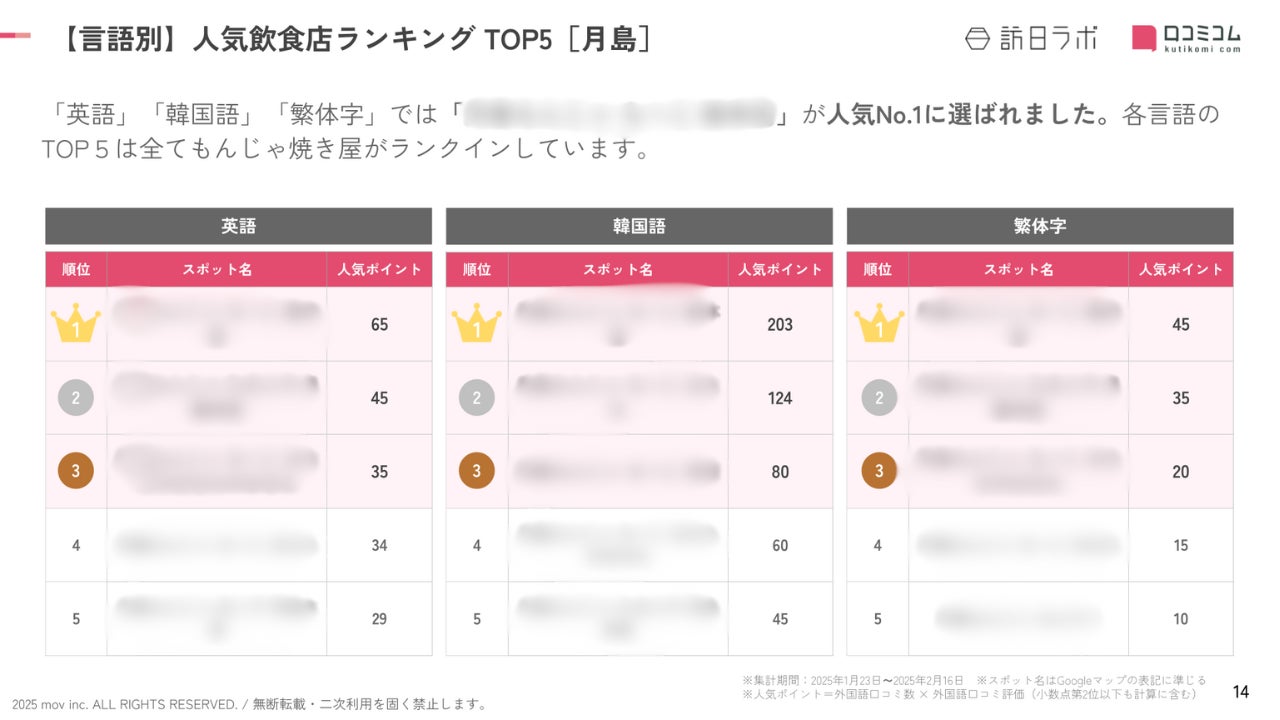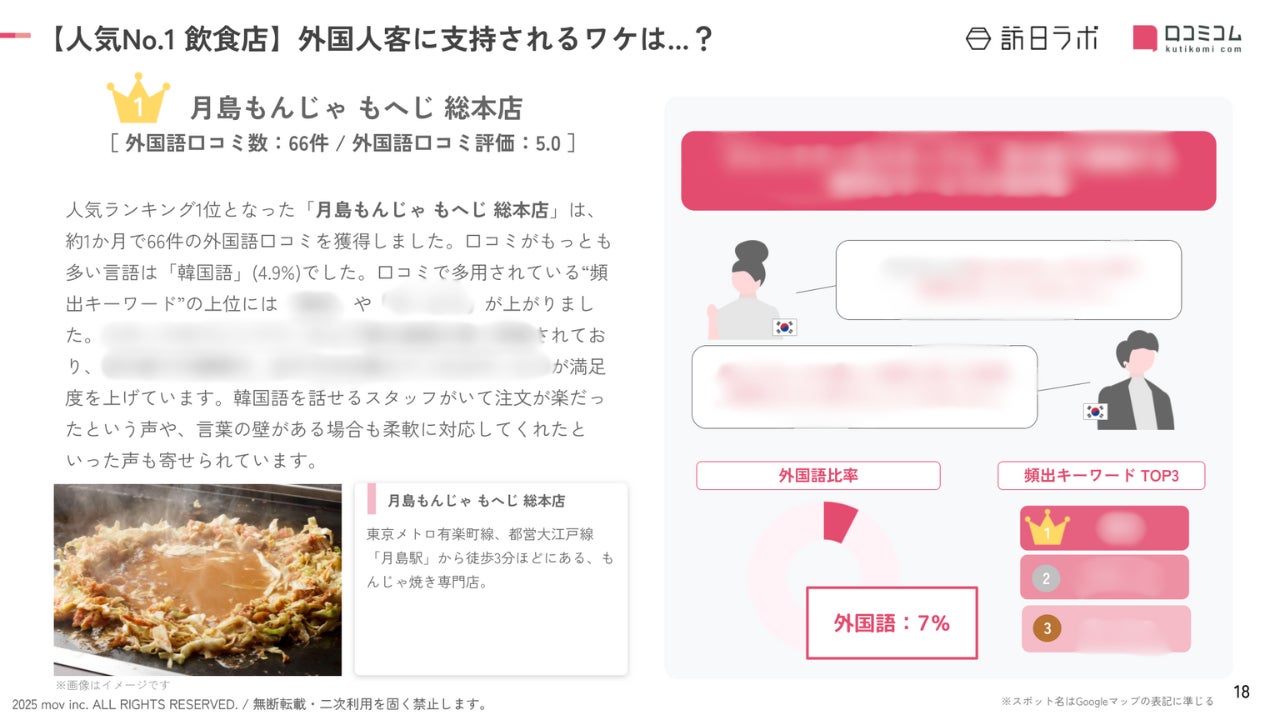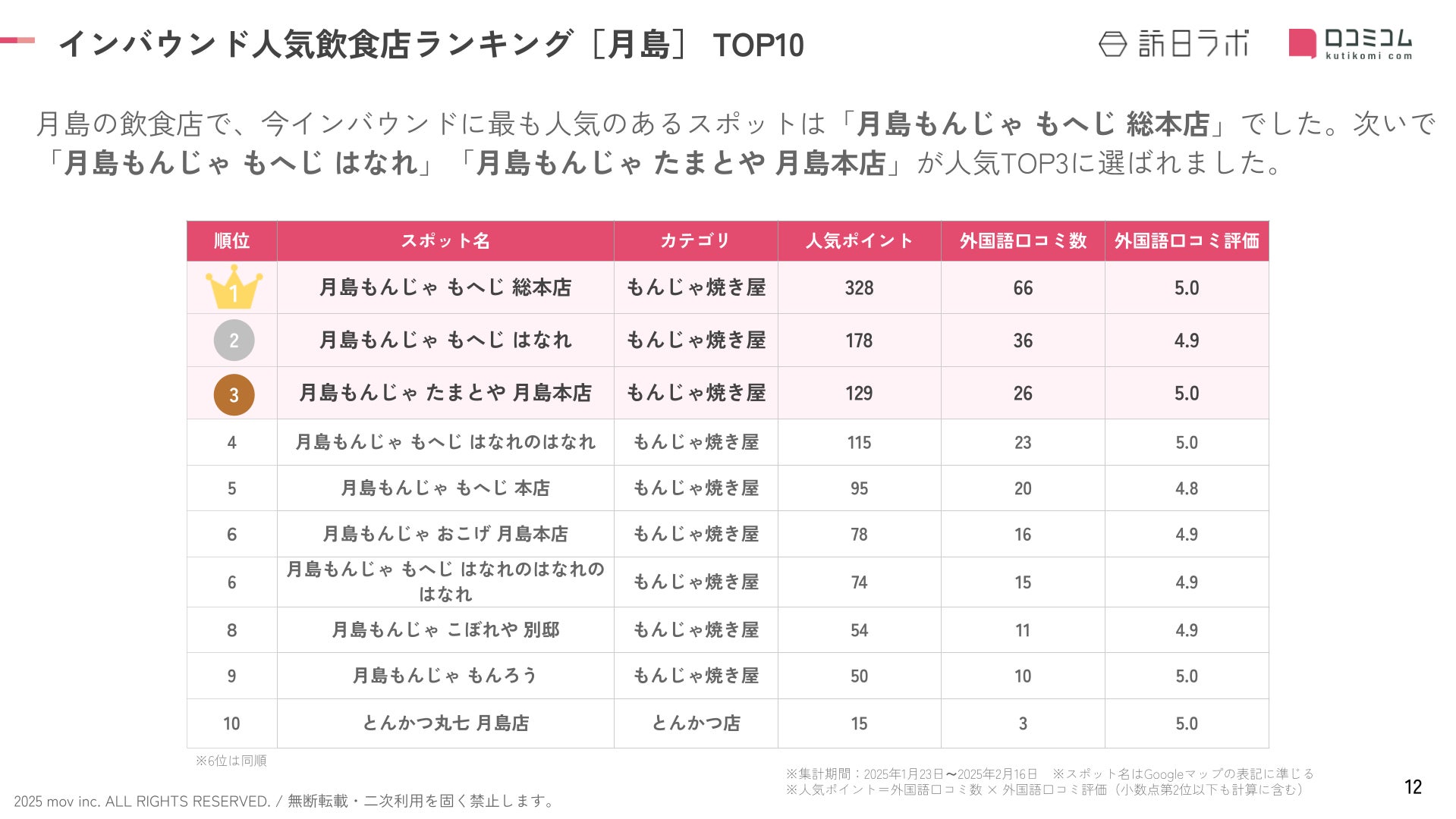 業界最大級のインバウンドビジネスメディア「訪日ラボ」及び 店舗向け集客一元化プラットフォーム「口コミコム」を運営する株式会社mov(代表取締役:渡邊 誠、本社:東京都渋谷区、以下mov)は、月島エリアの飲食店に寄せられた最新の口コミデータから、独自の『インバウンド人気観光地ランキング』を発表しました。